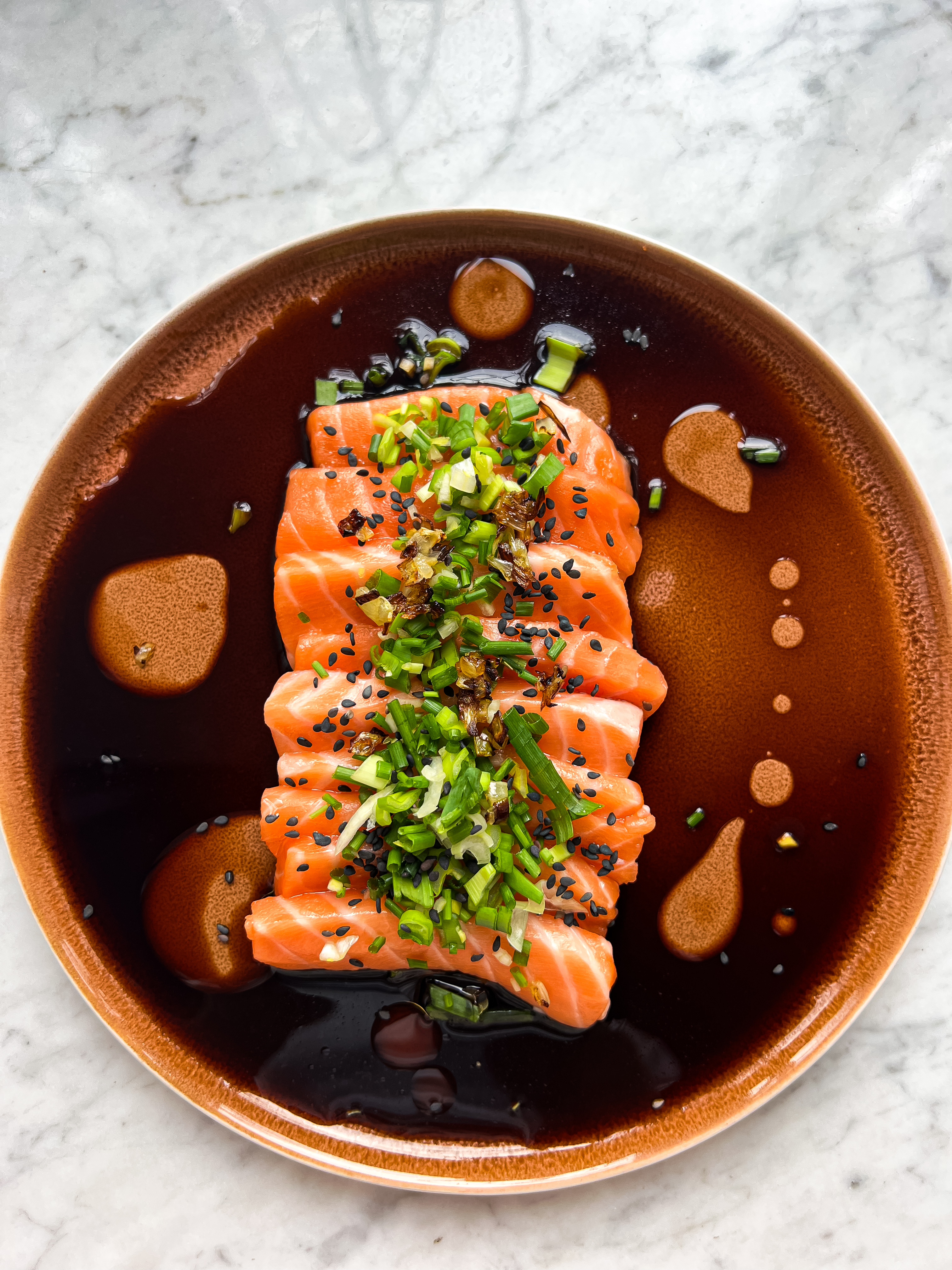 Na płaskim talerzu rozłóż plastry łososia w wachlarz lub okrąg – jak Ci się podoba. Dookoła skrop talerz sosem ponzu i olejem sezamowym, a kilka kropel polej bezpośrednio na łososia. Sos ponzu doda lekkiej kwasowości, a olej sezamowy – głębi smaku i orzechowego aromatu.