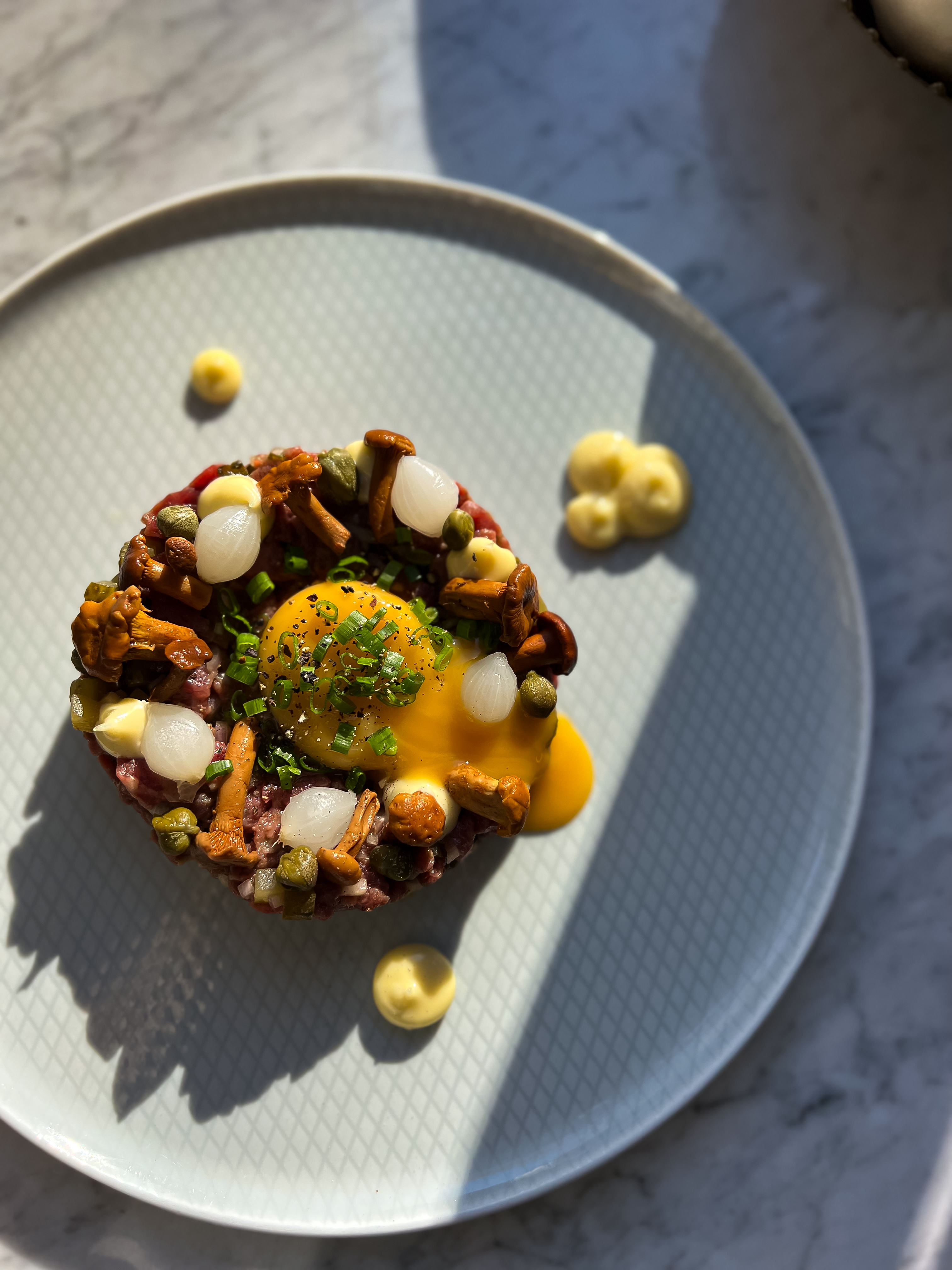 Po wymieszaniu składników uformuj tatara na talerzu – możesz użyć obręczy kucharskiej, by uzyskać równy kształt. Na wierzchu ułóż świeże żółtko – najlepiej, jeśli jest lekko schłodzone, wtedy pięknie się prezentuje.