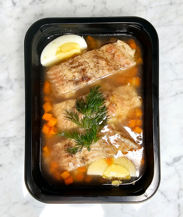 Skład:wywar rybny, sum afrykański filet , marchew, korzeń selera, korzeń pietruszki, jajka, żelatyna, sól, czosnek świeży, sos sojowy, sos rybny, koperek świeży, pieprz, liść laurowy,