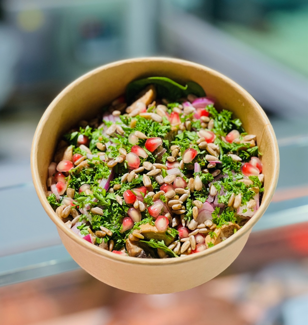 - Skład: kasza bulgur, łosoś, pieczarki, pomidory suszone, awokado, cebula czerwona, granat, olej rzepakowy, pestki słonecznika, sok z cytryny, szpinak baby, musztarda miodowa, natka pietruszki, miód