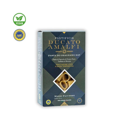 Właściwości kulinarne: Makaron Paccheri Ducato d'Amalfi wyróżnia się sprężystą, pełną strukturą i delikatnie orzechowym aromatem. Jego porowata powierzchnia doskonale zatrzymuje sosy – zarówno mięsne ragù, jak i lekkie, śródziemnomorskie kompozycje z owocami morza. To makaron, który nie rozgotowuje się, zachowując idealną konsystencję al dente nawet po dłuższym gotowaniu. Stanowi doskonałą bazę do kreatywnych dań kuchni włoskiej, podkreślając smak każdego składnika.