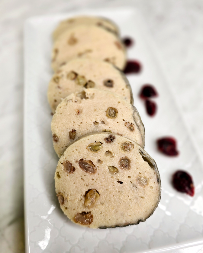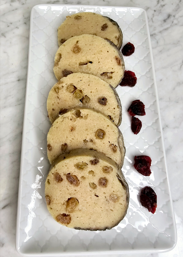 Składniki: karp, bułka pszenna, jaja, śmietana, żelatyna, masło, rodzynki, cebula, sól, pieprz.
