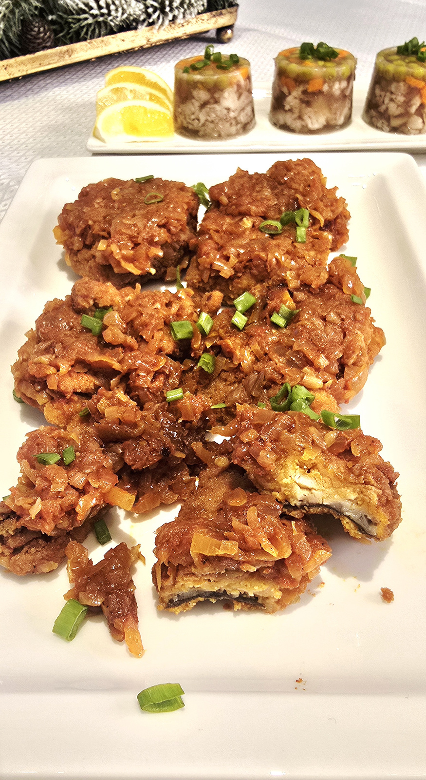 - Składniki: mięso karpia, pomidory, cebula, koncentrat pomidorowy, jaja, mąka, bułka tarta, sól, pieprz, olej