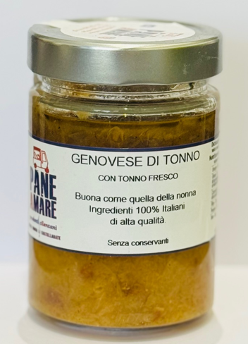 • Rzemieślnicze Genovese z świeżego tuńczyka, cebuli i warzyw. Przygotowane wyłącznie z naturalnych, włoskich składników. Duszone na niskiej temperaturze, bez konserwantów. Gotowe do spożycia, pełne autentycznego smaku.