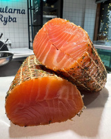 Gravlax z koperkiem, z pieprzem, naturalny marynowany filet łososia szkockiego w cukrze, wódka, czerwony pieprz, czosnek, koper zielony.
